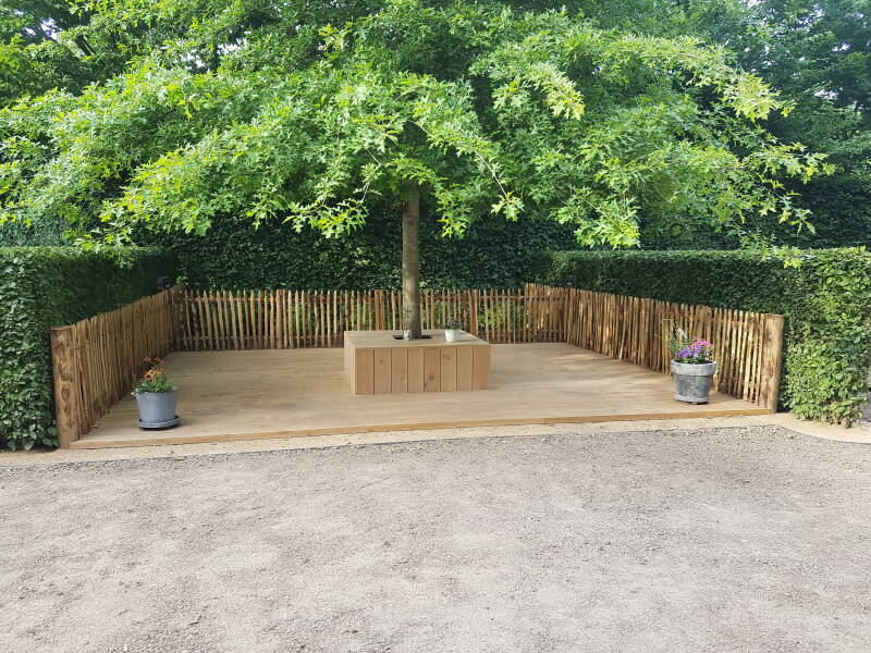 Wij hebben dit gedaan met een Svenhof kastanje omheining met Franse rondhout poortjes. Deze is bijzonder stevig gebouwd, waarbij het schapenhek van 80, 100 of 120cm hoog met een latafstand van 4cm gevezen wordt op dubbele horizontale liggers (Ø 4-6 cm) die op hun buurt ingewerkt en gevezen worden in de rechtstaande om de meter geplaatste palen van Ø 7-9cm en hoekpalen van Ø 10-12 cm of 13-16cm.